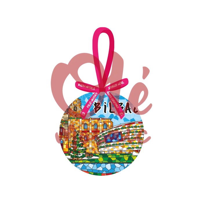 Olé Mosaic » Bolas de Navidad » Bola de Navidad con caja. Panorámica. Bilbao. Lazo rosa.