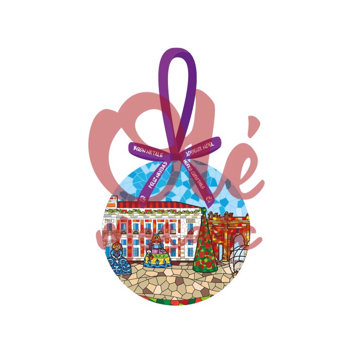 Bola de Navidad con caja, decorada con una colorida panorámica de Madrid. Esta esfera presenta un diseño exclusivo que representa la emblemática Plaza Mayor, con figuras vestidas a la usanza tradicional y un árbol de Navidad en el centro. Fabricada en material resistente, la bola destaca por sus vivos colores en mosaico y su acabado brillante. Incluye una elegante caja para un regalo perfecto, encapsulando la esencia navideña de la capital española.