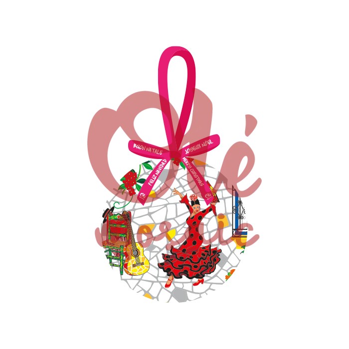 Bola de Navidad con caja, decorada con un diseño vibrante que evoca el folclore español. El adorno presenta una bailaora vestida de rojo con lunares negros, rodeada de elementos tradicionales como una guitarra y un mueble decorado. El fondo simula el icónico trencadís, característico de las calles andaluzas, aportando un aire festivo y cultural. Se presenta en una caja elegante, ideal para regalar y decorar tu hogar durante las fiestas.