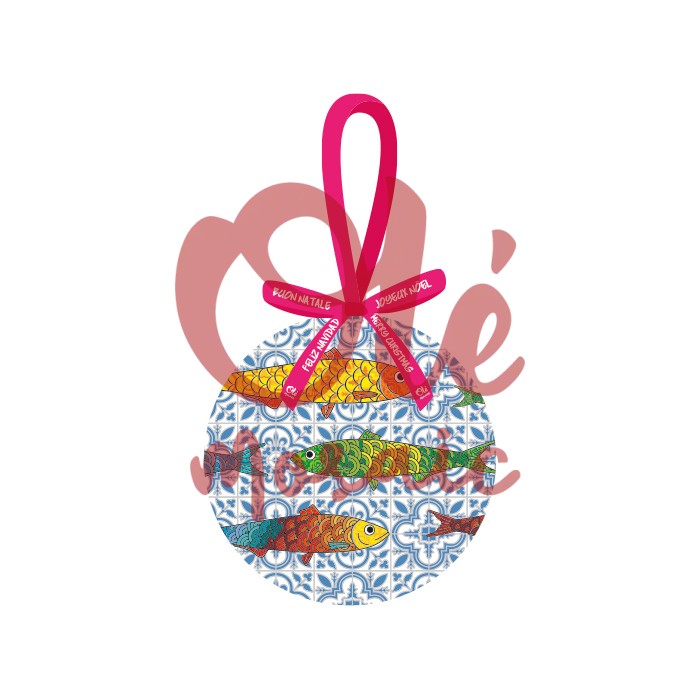 Bola de Navidad decorativa con caja. Inspirada en la rica tradición pesquera portuguesa, este adorno único es un símbolo del folclore y la cultura local. Fabricada en cerámica de alta calidad, la bola presenta coloridos motivos de sardinas, cuidadosamente pintados sobre un fondo de azulejos azules que evocan la estética típica de la cerámica portuguesa. Los vivos tonos amarillo, verde y rojo de las sardinas resaltan con elegancia, brindando un toque festivo a cualquier árbol de Navidad. Rematada con un delicado lazo rosa, esta bola no es solo un adorno, sino una pieza que narra una historia de tradición y alegría, convirtiéndola en un recuerdo especial para los visitantes que buscan llevarse un trozo de Portugal.