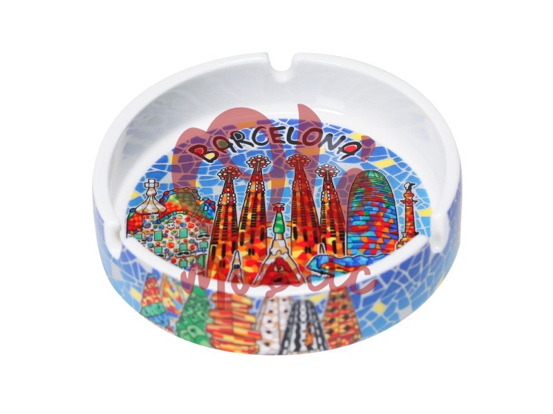 Cenicero de cerámica de 10 cm decorado con un diseño vibrante que representa los monumentos más emblemáticos de Barcelona. Sobre un fondo azul, la pieza destaca la Sagrada Familia y otros elementos arquitectónicos icónicos, todo ello plasmado en un estilo colorido que evoca los famosos mosaicos de Gaudí. Este cenicero es funcional y decorativo a la vez, ideal para añadir un toque artístico y cultural a cualquier espacio.
