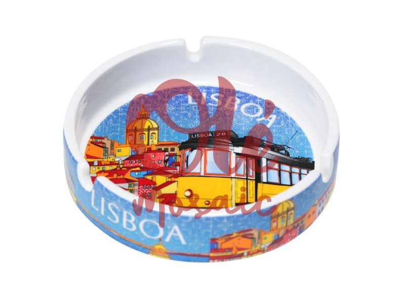 Cenicero de cerámica de 10 cm decorado con una vibrante representación de Lisboa. Este atractivo cenicero, en tonos azules y blancos, muestra el icónico tranvía amarillo sobre un fondo de colorido paisaje urbano, con edificios emblemáticos de la ciudad. La palabra «LISBOA» aparece elegantemente impresa en el exterior, añadiendo un toque distintivo. Ideal para quienes desean llevarse un pedazo de la esencia lisboeta a sus hogares.