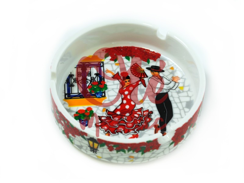 Cenicero de cerámica de 10 cm, decorado con una escena vibrante de un patio andaluz. Muestra a una bailaora con un traje de volantes rojos y a un bailaor con sombrero, ambos en pleno movimiento, rodeados de macetas con geranios y un balcón típico con rejas negras. El diseño incluye un fondo de mosaico en tonos blancos y detalles coloridos, lo que lo convierte en un elegante y llamativo recuerdo del folclore español.