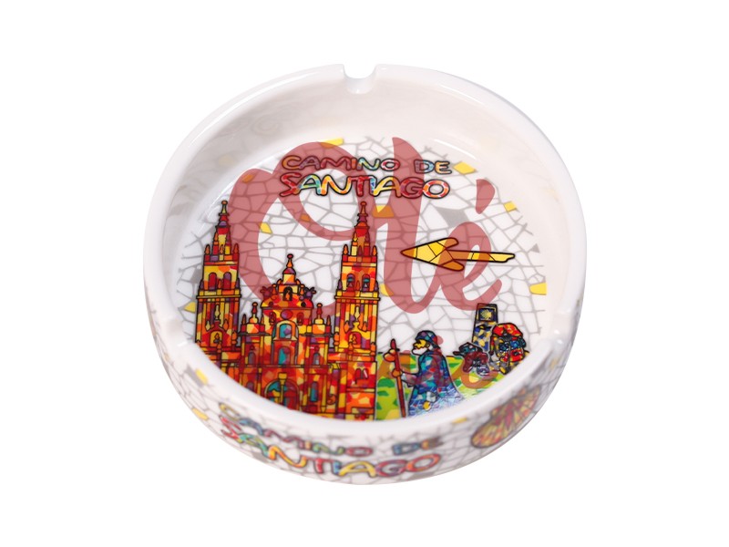 Cenicero de cerámica de 10 cm, inspirado en el Camino de Santiago. Este atractivo cenicero presenta una colorida ilustración de la Catedral de Santiago, destacando sus imponentes torres rojas y detalles amarillos. Decorado con un encantador mosaico alrededor del borde y la inscripción «CAMINO DE SANTIAGO», este producto combina funcionalidad y arte, convirtiéndose en un recuerdo ideal de la rica tradición de la peregrinación gallega.