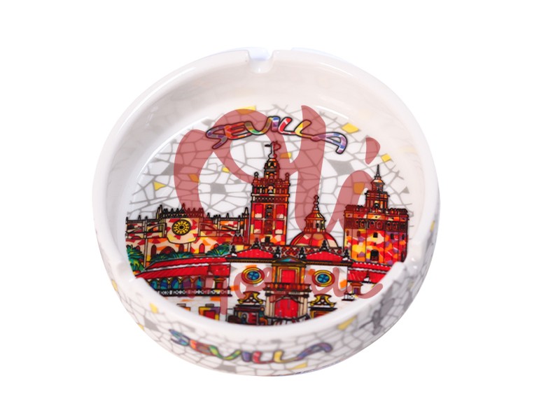 Cenicero de cerámica de 10 cm con un diseño vibrante inspirado en Sevilla. Este elegante cenicero presenta una colorida representación de monumentos emblemáticos de la ciudad, como la Giralda y la Plaza de España, con un acabado blanco que realza los detalles. Decorado con un mosaico que evoca el estilo andaluz, incluye la inscripción «Sevilla» en una tipografía atractiva, ideal para los amantes de la cultura española.
