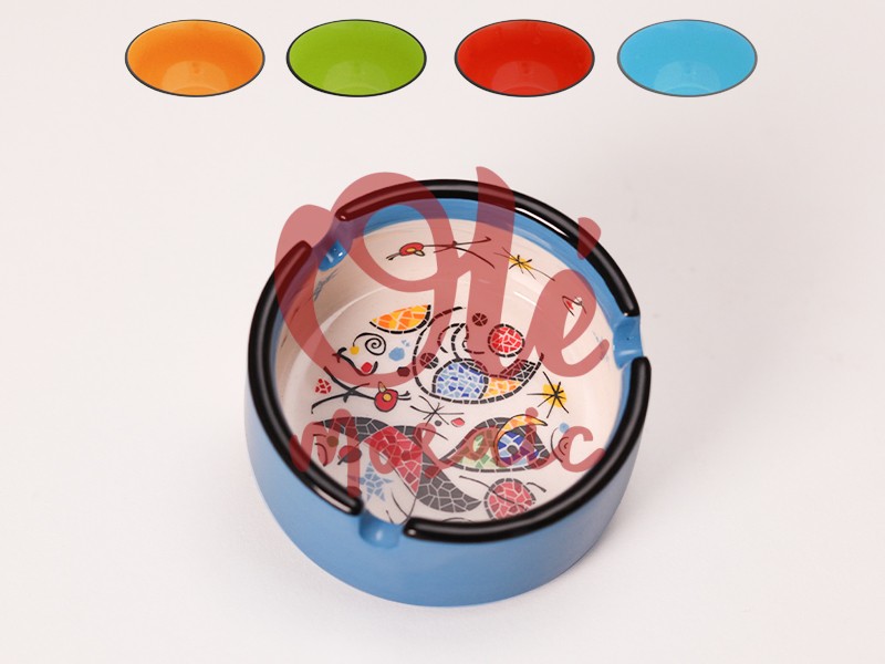 Cenicero de cerámica de 6 cm, decorado con un vibrante diseño que representa el arte del «Punt de trobada». Este atractivo cenicero presenta una base beige y un borde azul, resaltando elaborados motivos en negro, rojo, naranja y azul, que evocan un estilo artístico contemporáneo. Ideal para cualquier espacio, combina funcionalidad y estética, convirtiéndose en un elegante accesorio decorativo.