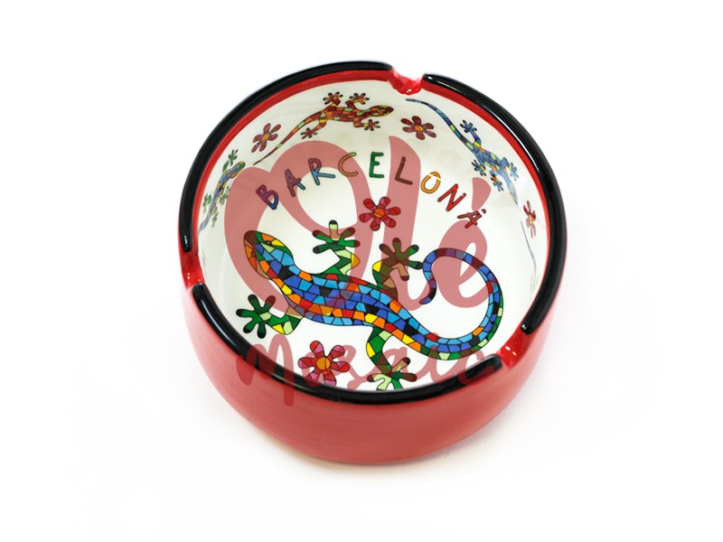 Este cenicero de cerámica de 6 cm es un encantador souvenir de Barcelona que refleja la vibrante estética del arte catalán. Su base beige contrasta magistralmente con un borde rojo vibrante, creando un efecto visual atractivo y alegre. La palabra «Barcelona» está elegantemente pintada con letras coloridas que evocan la energía y el espíritu de la ciudad. En su interior, este cenicero presenta una colorida salamandra decorada con un mosaico que remite al famoso estilo de Antoni Gaudí, una figura emblemática del modernismo que marcó el paisaje arquitectónico de la ciudad.