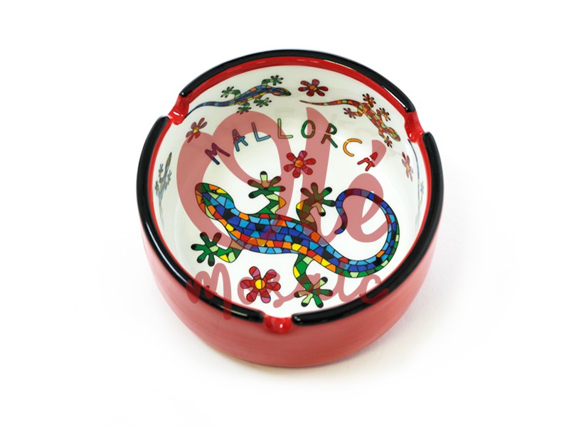 Cenicero de cerámica de 6 cm decorado con una colorida salamandra, inspirado en la belleza de Mallorca. Este elegante cenicero, diseñado en tonos beige y rojo, presenta un encantador motivo central: una salamandra en un vibrante diseño de mosaico. Rodeada de flores y con la palabra «MALLORCA» escrita de forma artística, esta pieza diseño artesanal, pintado a mano, combina funcionalidad con un toque decorativo, ideal para evocar la esencia de la isla.