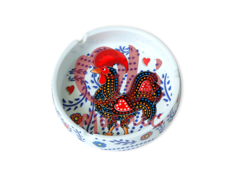 Cenicero de cerámica decorado con un gallo colorido, símbolo del folclore español, que destaca como un atractivo souvenir de la rica tradición cultural de España. Con un diámetro de 8 cm, este cenicero presenta una vibrante ilustración efecto pintada a mano, donde se muestra un gallo en tonos rojos, amarillos y negros, rodeado de delicados motivos florales y corazones azules y blancos. La cerámica blanca actúa como un lienzo perfecto, realzando los colores vivos y el diseño alegre que evocan la esencia del arte popular español.