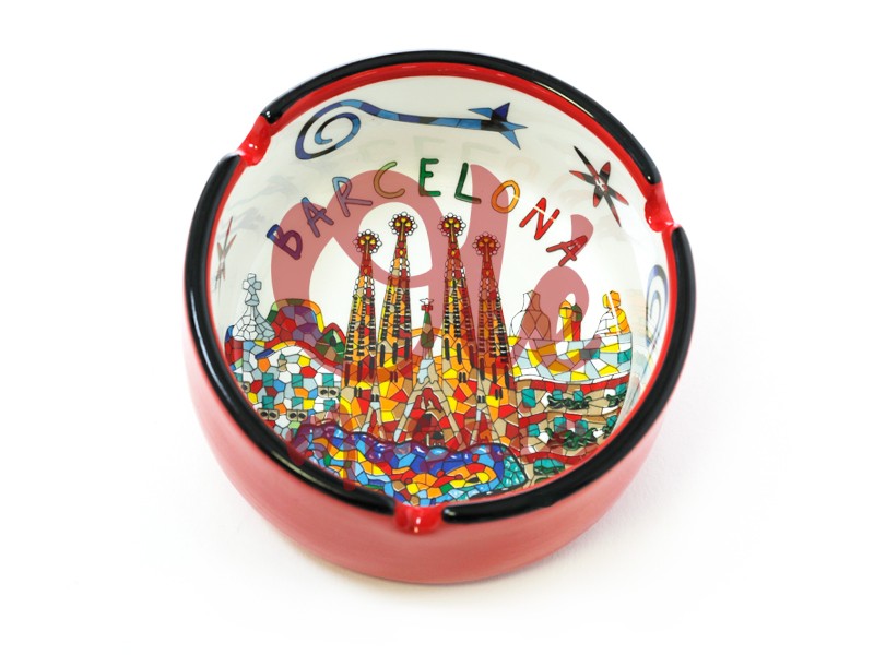 Cenicero de cerámica de 8 cm con una colorida panorámica de Barcelona. Este atractivo cenicero, con base beige y borde rojo, presenta una vibrante ilustración de la icónica Sagrada Familia junto a otros monumentos emblemáticos de la ciudad, en un encantador estilo de mosaico que evoca las obras del célebre arquitecto Antoni Gaudí. Cada detalle del diseño, creado y decorado a mano, resalta la diversidad y el espíritu único de Barcelona, haciendo hincapié en su rica herencia cultural. La palabra «Barcelona» se dibuja con letras coloridas en la parte superior, convirtiendo este cenicero no solo en un objeto funcional, sino también en un atractivo recordatorio de la belleza que esta ciudad ofrece a sus visitantes.