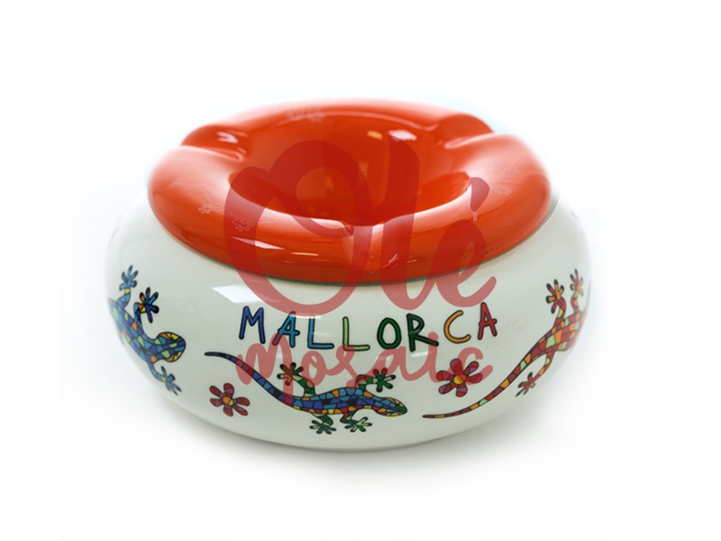 Cenicero de cerámica de 9 cm, decorado con vistosas salamandras y el nombre «MALLORCA». Este atractivo cenicero, con acabado en beige y tapa superior naranja brillante, presenta salamandras en mosaicos coloridos y flores, que le dan un toque alegre y regional, reflejando la esencia de Mallorca. Su diseño artesanal, pintado a mano, lo convierte en una pieza única y encantadora para cualquier ambiente.