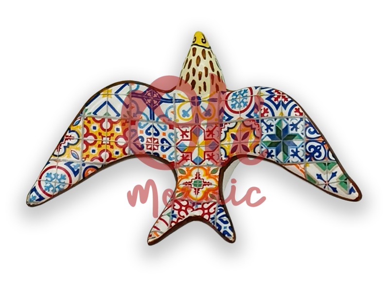 Colgador de cerámica con forma de golondrina, adornado con un mosaico de colores vibrantes. Este atractivo diseño incluye una mezcla de motivos geométricos y florales típicos de la cerámica española, evocando la rica tradición artística de la región. La pieza, diseño artesanal, pintado a mano, rinde homenaje a la fauna local, siendo la golondrina un símbolo de la llegada de la primavera en muchas culturas. Ideal para decorar cualquier espacio con un toque distintivo y lleno de color.