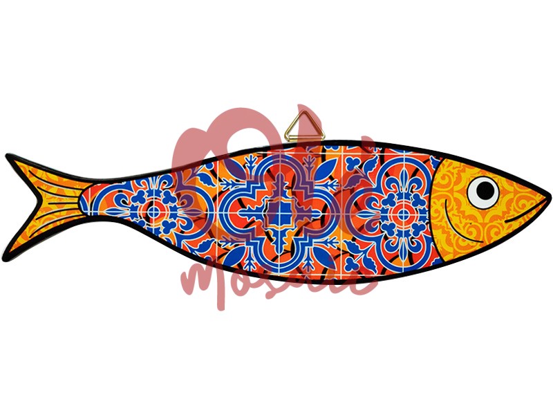 Colgador de cerámica con forma de sardina, decorado con motivos vibrantes de azulejos en tonos azules, naranjas y amarillos. Este diseño artesanal, pintado a mano, captura la esencia del folclore marino de la costa portuguesa. Su forma estilizada y su alegre decoración lo convierten en un elemento decorativo distintivo, ideal para la cocina o el comedor, añadiendo un toque colorido y cultural a cualquier espacio.