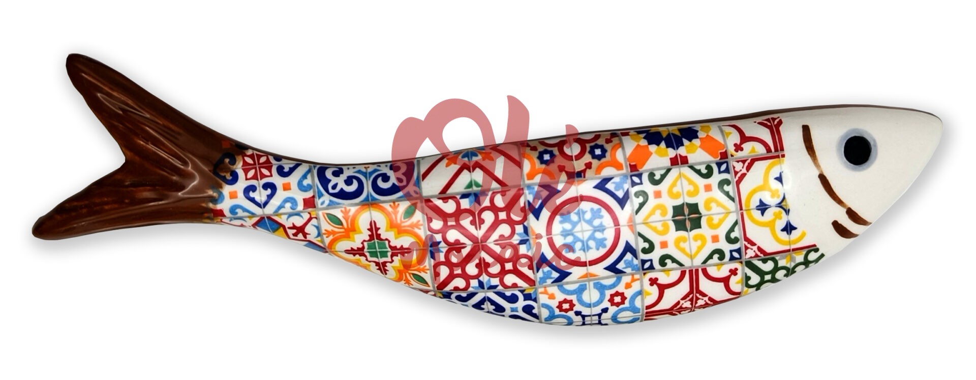 Colgador de cerámica con forma de sardina, decorado con un vibrante mosaico de colores y motivos tradicionales. Este atractivo artículo presenta un diseño muy especial que captura la esencia del folclore mediterráneo, con su superficie adornada en tonos rojos, azules y amarillos. Elaborado a mano, cada pieza refleja la maestría artesanal de la región, aportando un toque alegre y auténtico a la decoración de cualquier hogar.