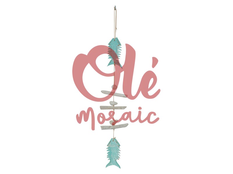 Colgante de madera con diseño de peces, ideal para darle un toque marinero a cualquier espacio. Este adorno encantador está compuesto por varias piezas de madera pintadas en tonos aguamarina y blanco, que representan peces estilizados y contrastan con elementos decorativos como palos y cuentas. Con una estética fresca y natural, es un regalo perfecto que evoca la tradición marítima de las regiones costeras españolas.