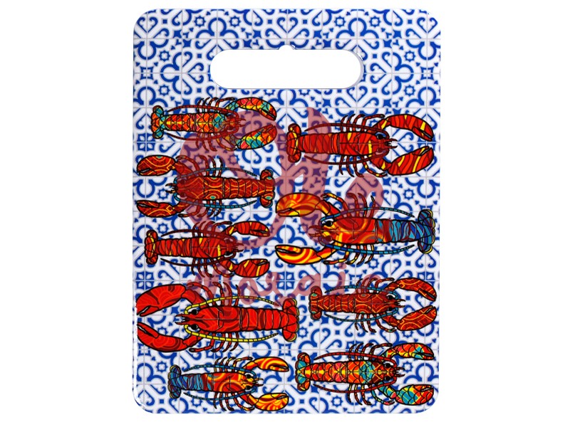 Cortador de cerámica decorado con una vibrante ilustración de bogavantes, ideal para darle un toque mediterráneo a tu cocina. Fabricado en cerámica de alta calidad, este cortador presenta un fondo azul que evoca los azulejos tradicionales portugueses, mientras que los bogavantes, pintados con detalles coloridos, destacan en tonos rojos y amarillos. Su diseño, además de ser funcional, actúa como un atractivo elemento decorativo.