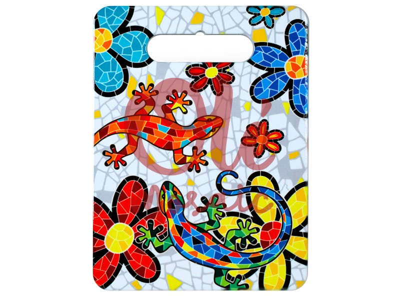 Cortador de cerámica decorado con motivos coloridos de salamandras y flores, inspirado en el estilo mosaico típico de España. Este práctico utensilio de cocina está fabricado en cerámica, lo que le proporciona una superficie resistente y fácil de limpiar. Sus vibrantes colores, como el rojo, el azul y el amarillo, destacan sobre un fondo claro, creando un diseño atractivo y alegre. Ideal para añadir un toque folclórico a tus comidas diarias.