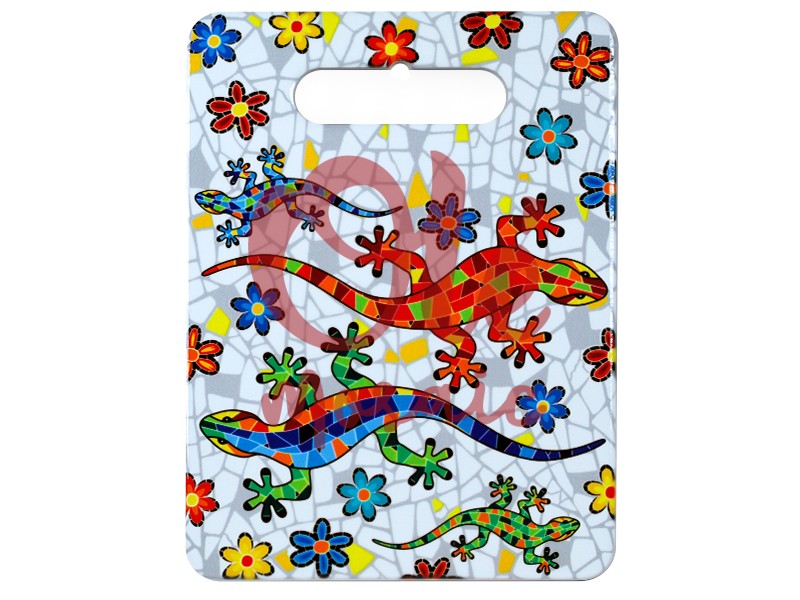 Cortador de cerámica decorado con motivos de salamandras y flores, inspirado en el colorido mosaico andaluz. Este práctico accesorio presenta un diseño vibrante en tonos rojos, verdes y azules, con salamandras en diversas posiciones sobre un fondo que simula azulejos. Fabricado en cerámica, combina funcionalidad y arte, lo que lo convierte en un souvenir ideal para los amantes de la cultura española y los detalles artesanales. Perfecto para añadir un toque andaluz a tu cocina.