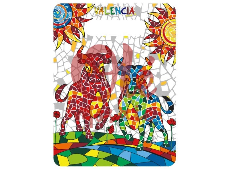 Cortador de cerámica diseño artesanal, pintado a mano, inspirado en la tradición taurina valenciana. Este utensilio de cocina presenta un vibrante diseño de dos toros en mosaico, uno rojo y otro azul, rodeados de coloridas flores y soles estilizados en tonos cálidos. La técnica de cerámica y el detallado acabado lo convierten en un elemento decorativo ideal para los amantes de la gastronomía y el folclore español, aportando un toque auténtico y artístico a cualquier cocina.