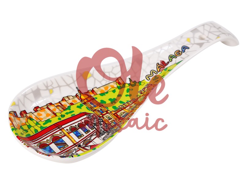 Cucharón de cerámica decorado con una pintoresca ilustración de Málaga que presenta un colorido paisaje urbano. Este elegante cucharón blanco exhibe detalles artísticos que destacan el emblemático centro de la ciudad, con sus característicos edificios y un toque de verde que evoca sus jardines. La palabra «Málaga» está impresa en colores vibrantes, complementando el diseño y convirtiendo este objeto en una pieza ideal como recuerdo o utensilio de cocina decorativo.