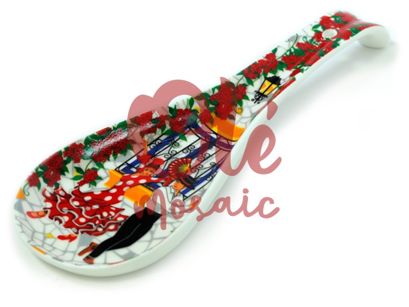 Cucharón de cerámica decorado, inspirado en los encantos de un patio español típico. Este utensilio presenta una base blanca adornada con vibrantes detalles pictóricos: rosas rojas y una pareja bailando flamenco, enmarcados por una reja de hierro forjado. La escena captura la esencia cultural del flamenco, originario de Andalucía, y aporta un toque artístico y funcional a tu cocina. Ideal como recuerdo o para añadir un detalle folclórico a tu hogar.