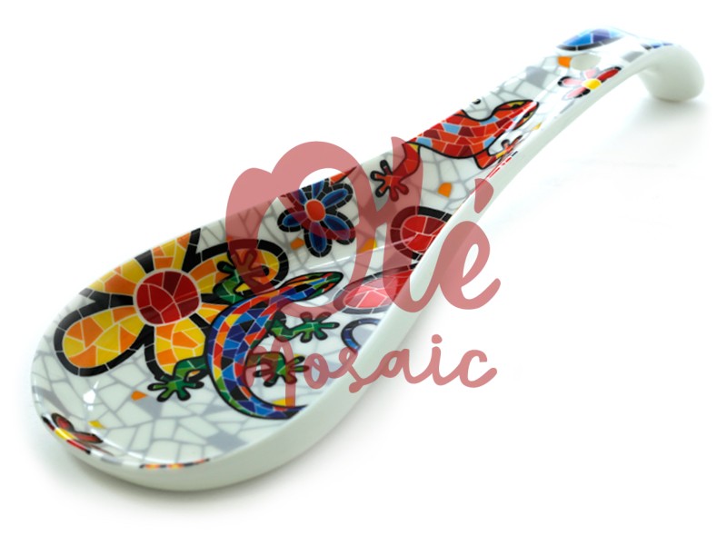 Cucharón de cerámica decorado con una vibrante salamandra y flores, perfecto para añadir un toque de color a tu cocina. Este elegante utensilio, fabricado en cerámica con un acabado blanco, presenta un diseño pintado a mano que destaca por su rica paleta de colores rojos, amarillos y azules, enmarcado por un fondo gris con un efecto de mosaico. La salamandra, representada con un estilo artístico que refleja la tradición española, simboliza la vida y la transformación, mientras que las flores aportan un aire fresco y alegre, ideales para adornar cualquier comida. Este cucharón no solo es funcional para servir tus platos favoritos, sino que también se convierte en una pieza decorativa que captura la esencia del arte cerámico español. Su autenticidad y el cuidado en los detalles hacen de este cucharón un souvenir perfecto para turistas que busquen llevarse a casa un recuerdo significativo de la rica cultura culinaria de España. En Olé Mosaic, como mayoristas de utensilios de cerámica, ofrecemos productos que celebran esta tradición en cada detalle, asegurando una excelente calidad y variedad para tiendas de regalos turísticos que buscan ofrecer souvenirs auténticos y representativos de la cultura española.