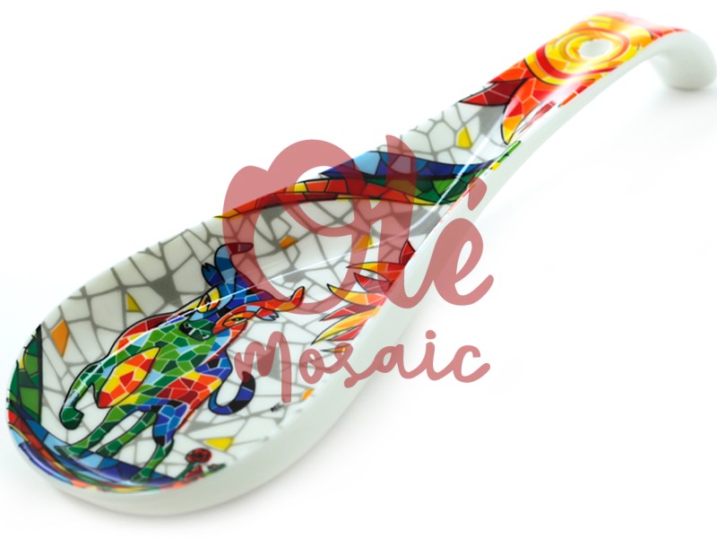 Cucharón de cerámica blanco decorado con coloridos motivos taurinos, ideal para darle un toque español a tu cocina. Su diseño presenta una vibrante combinación de mosaicos, con un toro en tonos verdes y rojos rodeado de patrones abstractos sobre fondo blanco. La técnica cerámica empleada garantiza durabilidad, mientras que su estilo colorido y distintivo refleja la rica cultura del folclore español. Perfecto como recuerdo o utensilio de cocina.