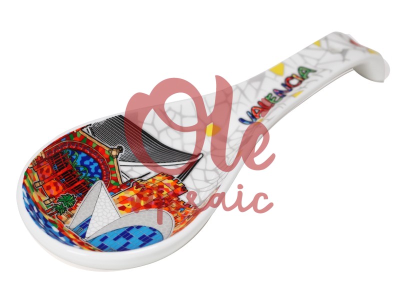 Este cucharón de cerámica decorada es un sofisticado recuerdo inspirado en la vibrante ciudad de Valencia, un destino emblemático del Mediterráneo. Su diseño colorido captura la esencia arquitectónica de la región, ilustrando monumentos icónicos como la Ciudad de las Artes y las Ciencias, que destaca por sus formas futuristas y su impresionante belleza. Los tonos azules y rojos, presentes en el diseño, evocan el ambiente cálido y festivo de Valencia, mientras que el elegante acabado blanco brillante añade un toque moderno y atractivo.