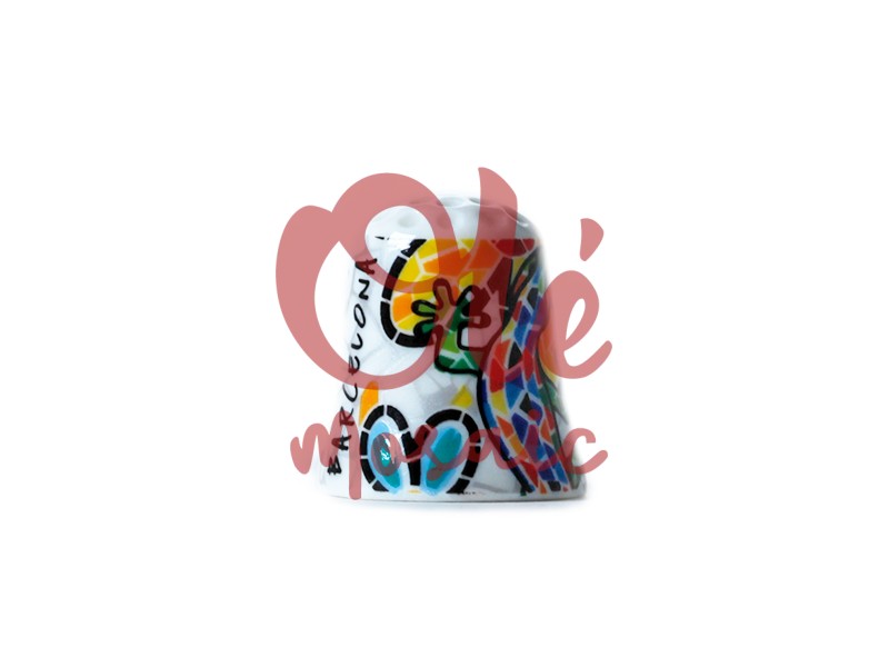 Dedal de cerámica decorado con una colorida salamandra y flores, inspirado en la arquitectura de Barcelona. Su diseño destaca por los vibrantes colores en tonos amarillos, verdes y azules, sobre un fondo blanco que resalta la belleza del motivo. Este dedal, que también incluye la palabra «Barcelona», es una pieza perfecta para coleccionistas y amantes del arte popular, ideal para recordar la riqueza cultural de la ciudad.