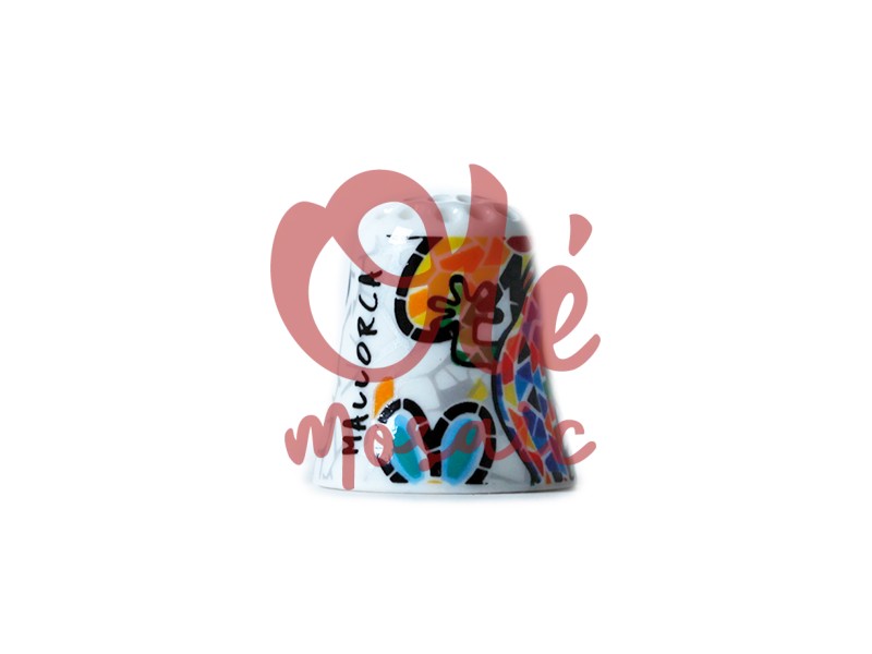 Dedal de cerámica decorado con una colorida ilustración de una salamandra y flores, que representa la riqueza natural de Mallorca. Este dedal, meticulosamente elaborado en cerámica blanca, es una pieza única que destaca por su diseño pintado a mano, donde cada detalle cobra vida gracias a una vibrante paleta de colores. La salamandra, símbolo de la biodiversidad de las Islas Baleares, se muestra en el dedal rodeada de flores, evocando la flora silvestre que adorna el paisaje mallorquín. El nombre «Mallorca» está elegantemente inscrito en un lateral, reforzando su identidad como un auténtico recuerdo de la región. Este dedal no solo es funcional para la costura, sino que también se presenta como un entrañable recuerdo de su visita, ideal para coleccionistas y amantes de la artesanía. Con su estructura resistente y su atractivo diseño, este dedal de cerámica es una excelente opción para los turistas que deseen llevarse un pedazo de la tradición cultural de Mallorca. En Olé Mosaic, ofrecemos este delicado souvenir, convirtiéndonos en su distribuidor de confianza de recuerdos auténticos y de calidad, perfectos para tiendas de regalos turísticos y amantes de la cultura balear.