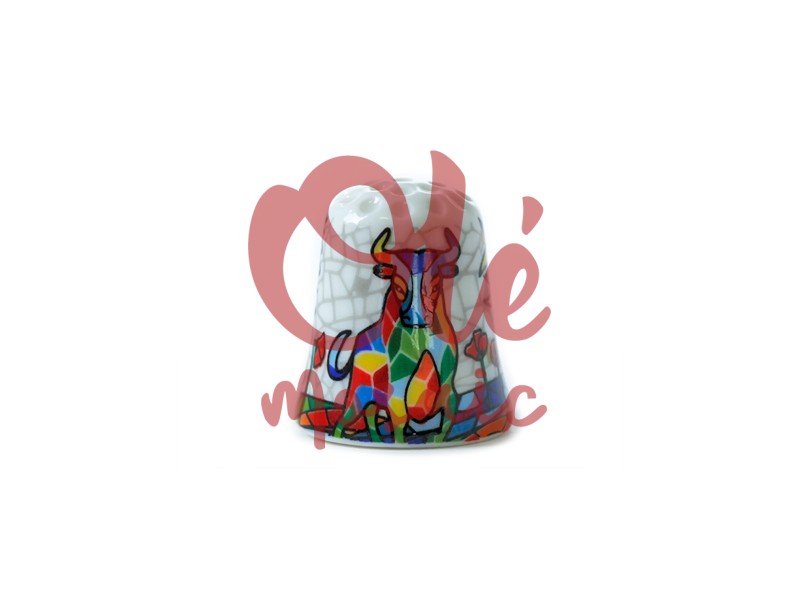 Dedal de cerámica decorado con un vibrante diseño de toros, que representa un símbolo emblemático de la cultura española. Este dedal blanco presenta un acabado brillante y suave, adornado con un colorido mosaico que da vida al motivo del toro, rodeado de elementos florales. La pieza, diseño artesanal, pintado a mano, destaca por su originalidad y atención al detalle, lo que la convierte en un elegante recuerdo de España. Ideal para coleccionistas o como regalo.