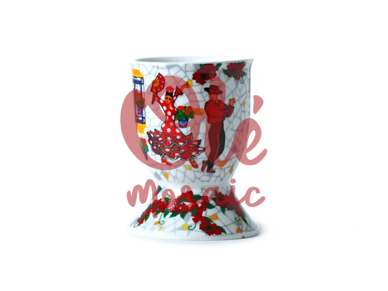 Huevera de cerámica decorada, inspirada en un vibrante patio andaluz. Este producto, con acabado blanco, presenta ilustraciones efecto pintadas a mano de una pareja de flamencos: la hembra, con un traje rojo de lunares, y el macho, con una camisa roja. Adornada con motivos florales en tonos rojos y verdes, la huevera evoca el espíritu festivo de Andalucía, convirtiéndose en una pieza funcional y artística para cualquier hogar.