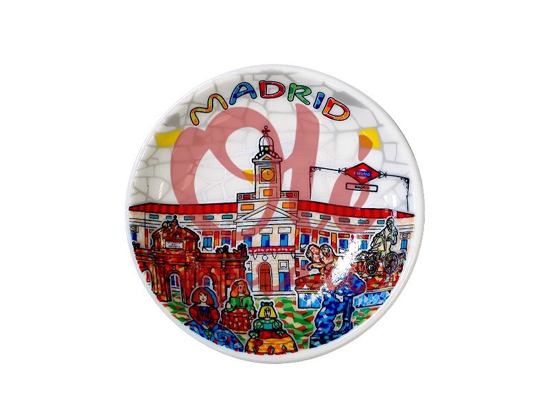 Imán de cerámica de forma redonda, decorado con una colorida ilustración del emblemático edificio de la Puerta del Sol en Madrid. Este atractivo souvenir presenta un acabado blanco con detalles pintados a mano que reflejan la vibrante cultura madrileña, incluyendo un símbolo del metro y figuras representativas. Sus vivos colores y su diseño muy especial lo convierten en un recuerdo perfecto de la capital española, ideal para decorar cualquier nevera.
