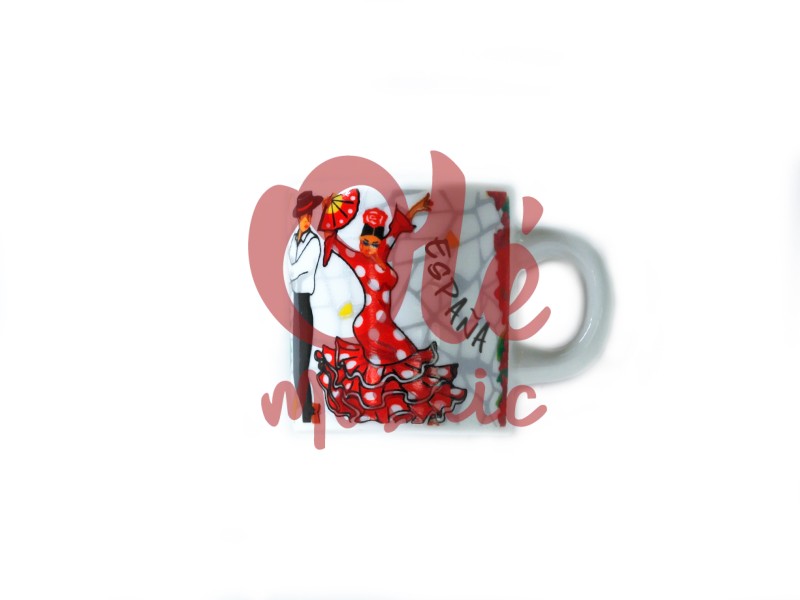 Imán de cerámica con el diseño de un vibrante patio andaluz. Este encantador imán muestra la ilustración de dos bailarines de flamenco: ella con un vestido de lunares rojos y él con sombrero, evocando la alegría del folclore español. Los colores brillantes y la palabra «España» completan la escena, y el fondo blanco resalta los detalles pintados a mano, convirtiendo este imán en un recuerdo perfecto de la cultura española.