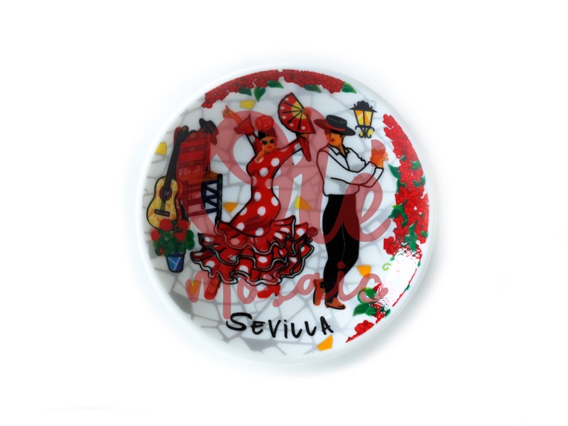 El nombre «Sevilla» está impreso de manera visible, enfatizando su conexión con esta icónica ciudad española, conocida por sus tradiciones flamencas y su cautivadora arquitectura. Este imán no solo funciona como una pieza decorativa, sino que también evoca la esencia del arte y la cultura andaluza, convirtiéndolo en un regalo ideal para turistas que buscan recuerdos auténticos y representativos. En Olé Mosaic, como distribuidores de recuerdos de calidad, garantizamos que este imán de cerámica será un brillante recordatorio de la belleza de Sevilla, perfecto para tiendas que buscan productos con valor cultural y atractivo visual.