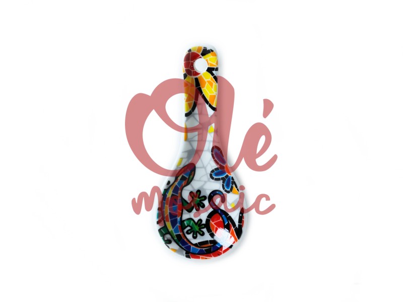 Este imán de cerámica con forma de cuchara es un auténtico homenaje a la rica cultura y el arte tradicional de España. Pintado a mano, este encantador recuerdo presenta una colorida salamandra entrelazada con flores vibrantes, simbolizando la conexión entre la fauna, la flora y la tradición. El fondo blanco del imán resalta a la perfección los vivos colores en azul, rojo y verde, enmarcados por líneas negras que aportan un elegante contraste a la obra.