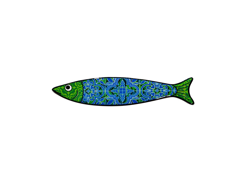 Imán de cerámica con forma de sardina, decorado con intrincados diseños en tonos verdes y azules. Este atractivo recuerdo captura la esencia del folclore marítimo, ideal para evocar la costa y la gastronomía portuguesa. Pintado con estilo artesanal, presenta detalles artísticos que recuerdan la tradición local, convirtiéndolo en una pieza decorativa singular. Perfecto para añadir un toque de color a cualquier superficie metálica.