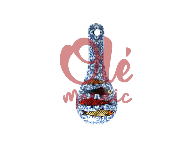 Imán de cerámica con forma de cuchara, decorado con alegres sardinas sobre un fondo blanco y motivos florales azules. Este imán, diseño artesanal, pintado a mano, presenta detalles vibrantes en los peces que evocan la rica tradición pesquera de la costa portuguesa. Su diseño muy especial combina la cerámica artesanal con una atractiva representación visual, perfecto para recordar los sabores del mar y la cultura mediterránea en cualquier hogar.