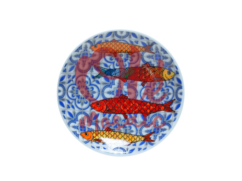 Este imán de cerámica decorado con sardinas es un encantador recuerdo que captura la esencia del mar y la tradición pesquera española. Presentado sobre un fondo blanco brillante, el vibrante diseño incluye cuatro sardinas en llamativos tonos anaranjados, rojos y verdes, que nadan alegremente sobre un delicado patrón azul inspirado en la cerámica típica de la región. Cada sardina aparenta estar pintada a mano, lo que garantiza que cada pieza sea única y rebose autenticidad.