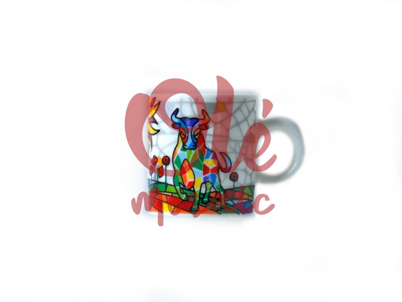 Imán de cerámica con un diseño llamativo de toros, ideal para recordar la esencia de España. Este imán presenta una vibrante mezcla de colores en un patrón de mosaico, con un toro en el centro rodeado de flores y un campo que evoca la tradición española. La base blanca realza los colores y los detalles del dibujo, convirtiendo este imán en un atractivo souvenir que añade un toque artístico a cualquier nevera o superficie metálica.