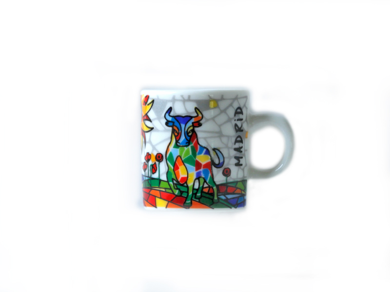 Este imán de cerámica con un vibrante diseño de toros es un auténtico símbolo de la cultura madrileña. Elaborado con un acabado brillante que resalta su base blanca, presenta un colorido mosaico que combina tonalidades de azul, rojo y amarillo, capturando la esencia de la tauromaquia, una de las tradiciones más emblemáticas de España. La ilustración muestra un majestuoso toro, rodeado de flores que aportan un toque de frescura y vitalidad al diseño, simbolizando tanto la fuerza del animal como la belleza de la naturaleza que adorna el paisaje español. El nombre «MADRID» está elegantemente impreso en uno de los laterales, añadiendo un distintivo que lo convierte en un souvenir ideal para turistas que buscan una representación auténtica de la capital.
