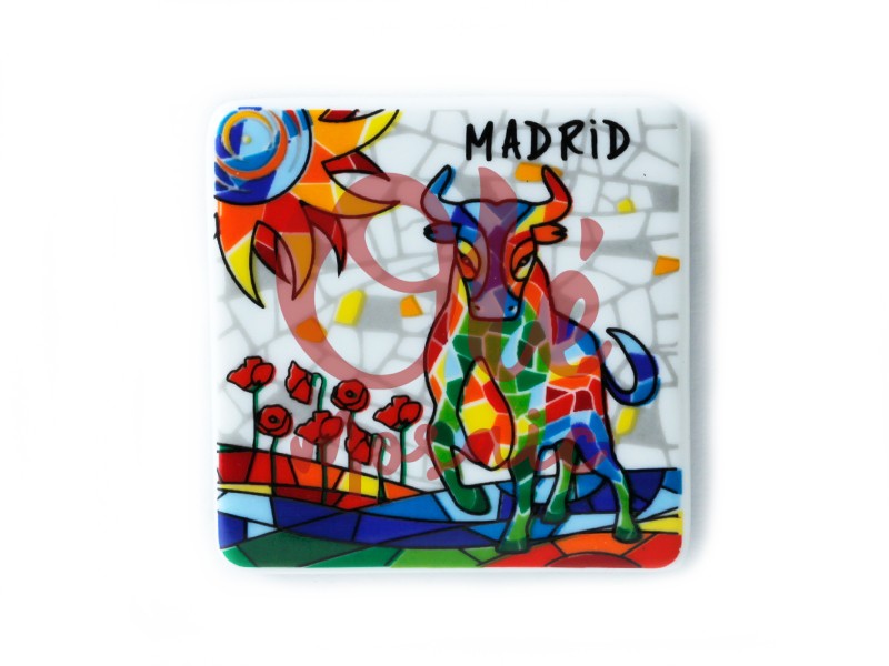 Imán de cerámica decorado con un vibrante toro, símbolo icónico de Madrid. Este imán destaca por su colorido diseño con tonos vivos y formas geométricas, sobre un fondo blanco que resalta el motivo principal. Además, presenta un paisaje de flores rojas y un sol estilizado, todo diseño artesanal, pintado a mano. La palabra «MADRID» se imprime en la parte superior, añadiendo un toque distintivo a este recuerdo que captura la esencia cultural de la ciudad.