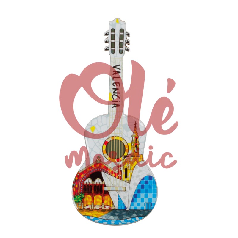 Imán de madera con forma de guitarra, que representa los monumentos emblemáticos de Valencia. Este atractivo recuerdo destaca por su colorido diseño inspirado en el arte del mosaico, tachonado de tonos vibrantes que evocan la Ciudad de las Artes y las Ciencias y la Lonja de la Seda. La palabra «Valencia» está impresa con estilo en la parte superior, añadiendo un toque distintivo a este imán que celebra la cultura y el patrimonio de la ciudad.