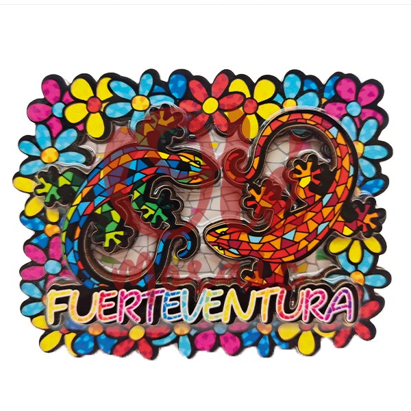 Imán de madera decorado con salamandras y flores coloridas, inspirado en la belleza natural de Fuerteventura. Este vibrante imán es una representación de la exuberante vida en las Islas Canarias, destacando un diseño lleno de color donde dos salamandras, una roja y otra azul, se entrelazan sobre un fondo de flores multicolores. La palabra “Fuerteventura” se presenta de forma prominente y atractiva, creando un souvenir distintivo que captura la esencia de la isla.