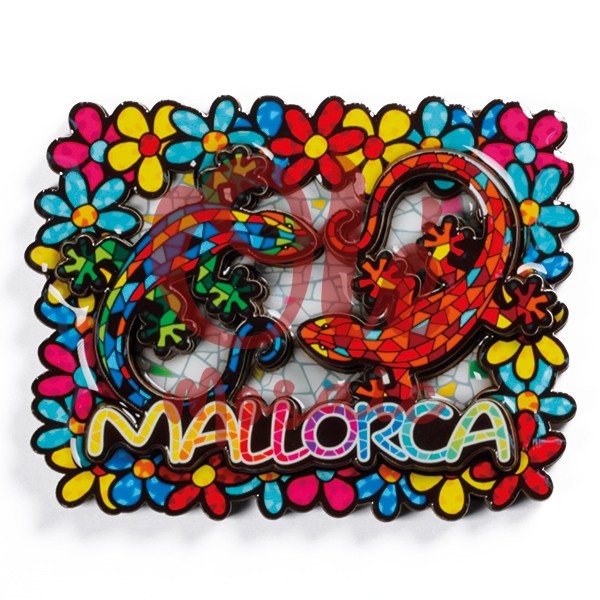La palabra «MALLORCA» resalta en la parte inferior, convirtiendo este objeto en el recuerdo perfecto para quienes visitan la isla y desean llevarse un trocito de su belleza. Este imán no es solo un simple souvenir, sino una representación cultural que celebra la rica biodiversidad y la tradición artística de la región. En Olé Mosaic, nos enorgullecemos de ofrecer productos auténticos y de calidad al por mayor, ideales para tiendas de regalos turísticos que deseen ofrecer a sus clientes un recuerdo característico de Mallorca. Este imán de salamandras es la opción perfecta para los turistas que buscan un souvenir memorable y colorido.