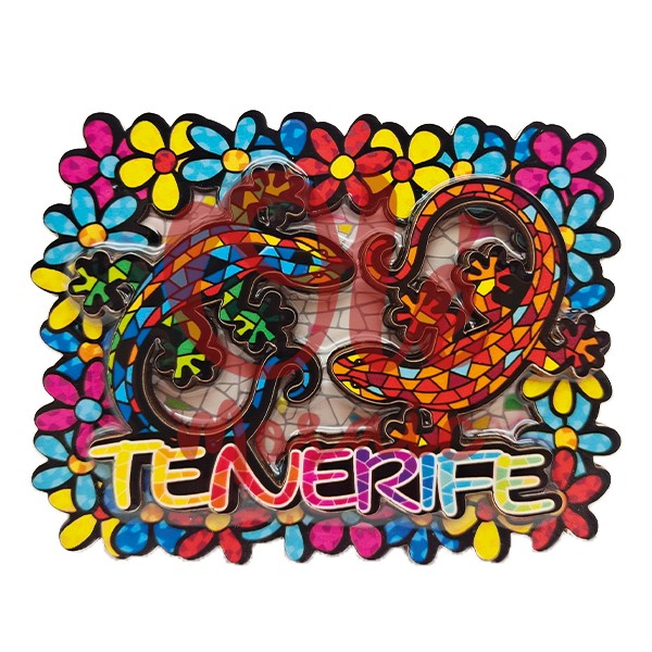 Imán de madera decorado con una encantadora ilustración de dos salamandras coloridas entre flores, que representa la belleza natural de Tenerife. Este imán, con un diseño vibrante en tonos azules, rojos y verdes, destaca por su acabado diseño artesanal, pintado a mano, y la inscripción «Tenerife» en letras llamativas. Ideal para recordar la arquitectura y la fauna de la isla, este souvenir resalta la diversidad y el colorido de su entorno.