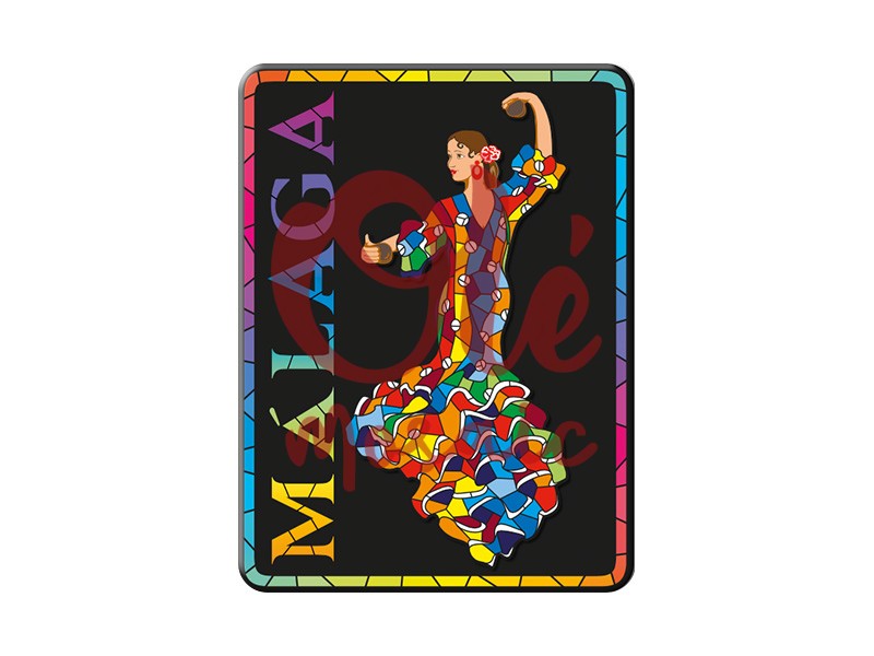 Imán metálico con ilustración de una bailaora de flamenco, inspirado en la tradición cultural malagueña. Este imán, de 8 cm, presenta una vibrante representación estilizada de una mujer vestida con un espectacular vestido de volantes, lleno de coloridos tonos que reflejan la alegría y la energía del flamenco. La bailaora, con una expresión radiante, adopta una pose dinámicamente elegante, destacando su vestido que se despliega en una danza colorida y brillante. El fondo negro realza los vibrantes colores del vestido y, en la parte superior, se aprecia la palabra «Málaga» en letras llamativas, agregando un toque distintivo y fácilmente reconocible al imán.