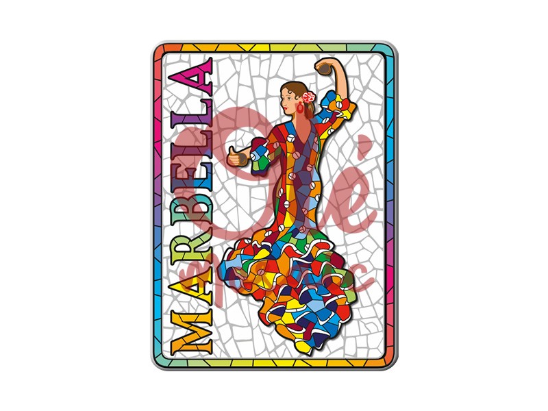 Imán metálico ilustrado con una vibrante bailaora ataviada con un vestido de colores que rinden homenaje al folclore andaluz, representando el encanto de Marbella. Con un tamaño de 8 cm, este imán destaca por su diseño colorido y su acabado plateado, evocando los mosaicos y la alegría de la cultura flamenca. La figura de la bailaora, capturada en movimiento, añade un toque artístico y festivo a cualquier superficie magnética.