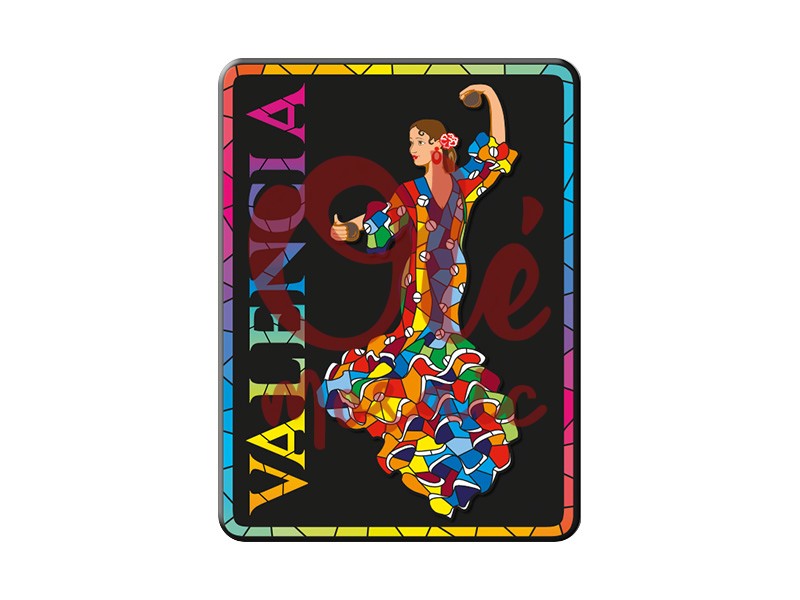 Imán metálico que representa a una bailaora con un vibrante vestido de flamenco, inspirada en el folclore valenciano. Este colorido imán, de 8 cm, presenta un diseño estilizado con detalles de mosaico que evocan la energía y la elegancia del baile español. La bailaora, adornada con un peinado tradicional y una flor roja, destaca sobre un fondo negro, mientras que la palabra «VALENCIA» en letras brillantes completa la pieza, convirtiendo este imán en un souvenir atractivo y alegre.