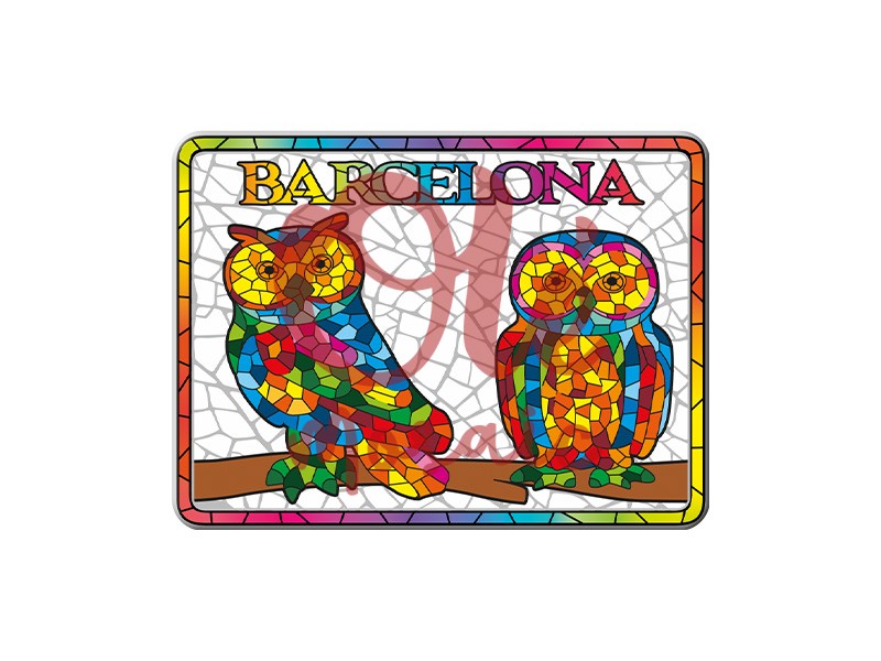 Imán metálico de 8 cm, ilustrado con un vibrante diseño de dos búhos al estilo mosaico, que evoca la colorida esencia de Barcelona. Este atractivo imán presenta detalles cerámicos con una paleta de colores vivos, con tonos azules, amarillos, rojos y verdes. La palabra «Barcelona» destaca en la parte superior, complementando el diseño artístico. Perfecto para llevar un fragmento de esta emblemática ciudad a tu hogar.